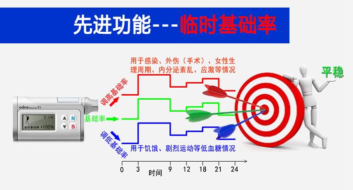 基础率调节稳定后。临时需要调高或降低基础率的浓度比值以避免高、低血糖波动对病情的影响。